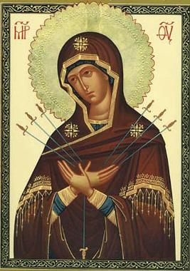 Podobne ako Krista prebodli klince a kopija, tak i duša Prečistej Panny bola prebodnutá smútkom a žiaľom, keď hľadela na utrpenie svojho Syna, „aby vyšlo najavo zmýšľanie mnohých sŕdc“ (Lk 2, 35)