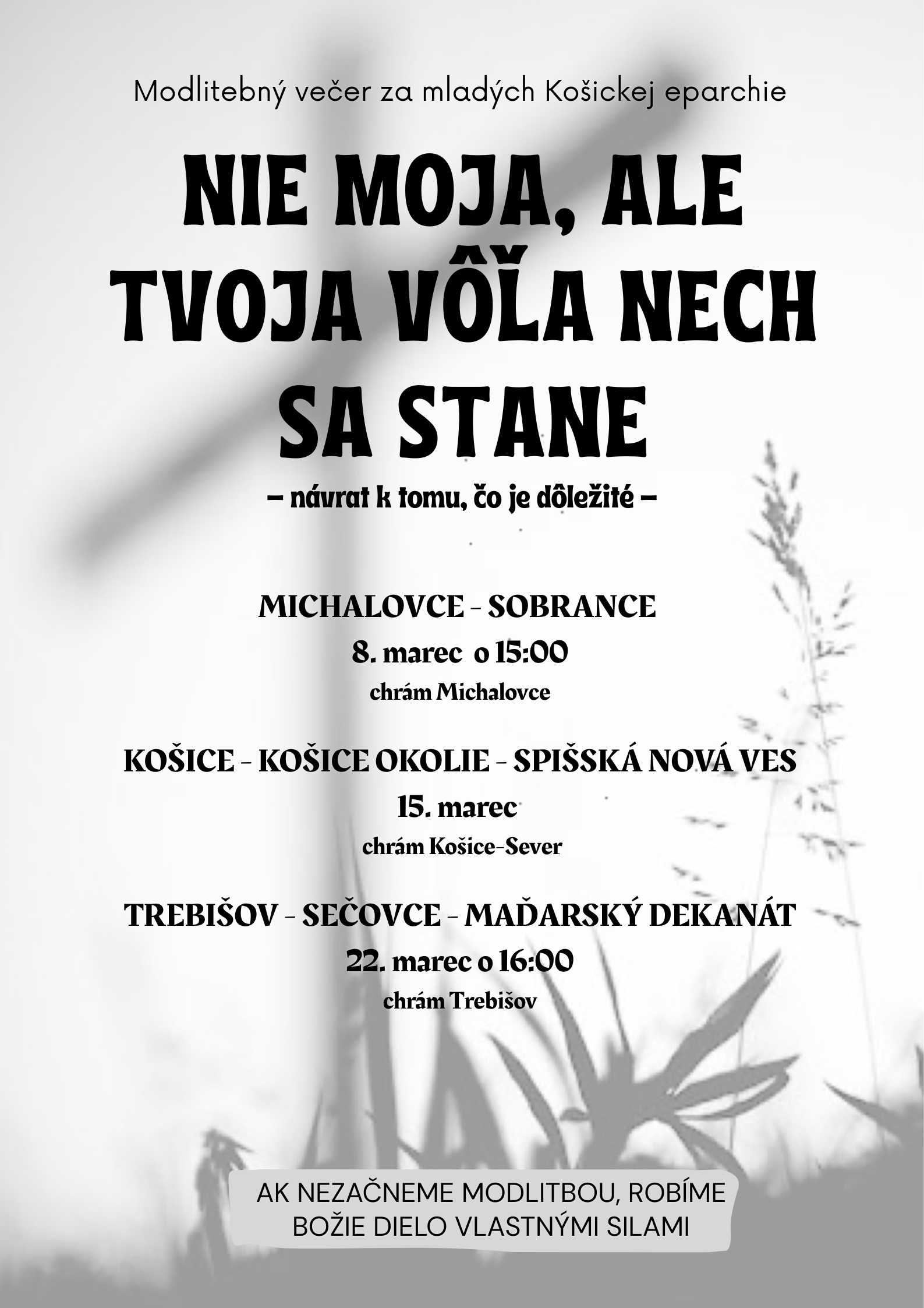 - V nedeľu 8. 3. 2026 o 15:00 sa v Michalovskom farskom chráme na Hollého ulici uskutoční Modlitbové stretnutie za mladých s názvom: „Nie moja, ale tvoja vôľa nech sa stane." Pozývame mladých i všetkých, ktorým záleží na budúcnosti Cirkvi, na mladých našich rodín, farností i celej eparchie. Súčasťou programu bude katechéza, Ježišova modlitba, svedectvo a možnosť sviatosti zmierenia. Viac na plagáte.